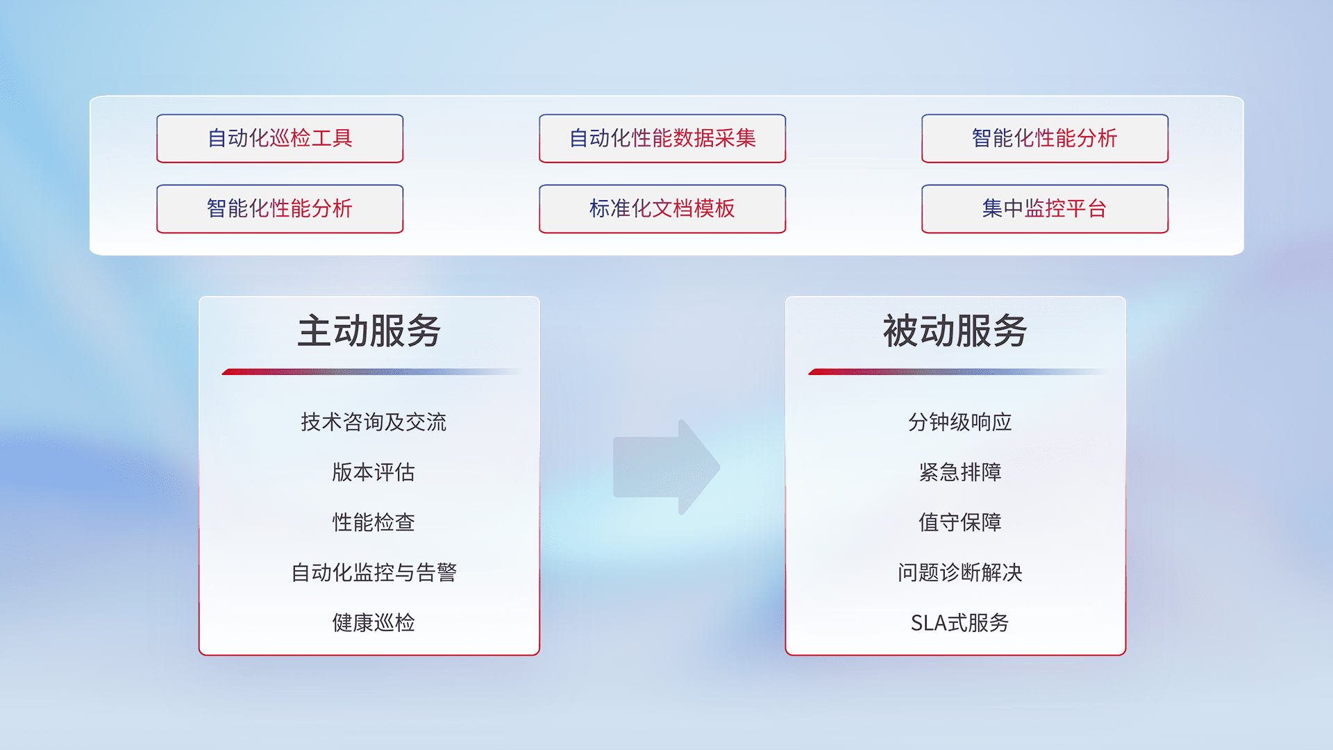 智能化工具和标准化文档,,,保障服务质量,,,提供主动服务(包含技术咨询、、、版本评估、、、性能检查、、自动化监控与告警、、健康巡检)和被动服务包含(分钟级响应、、、紧急排障、、、、值守保障、、、、问题诊断解决、、、SLA服务)。。。。